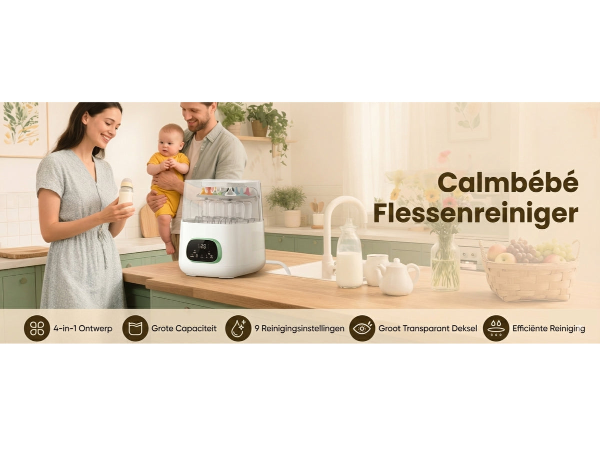 De Calmbébé Pro wast, steriliseert én droogt je babyflessen automatisch. Bespaar 2+ uur per dag en geniet van 100% hygiënische flessen met één druk op de knop.